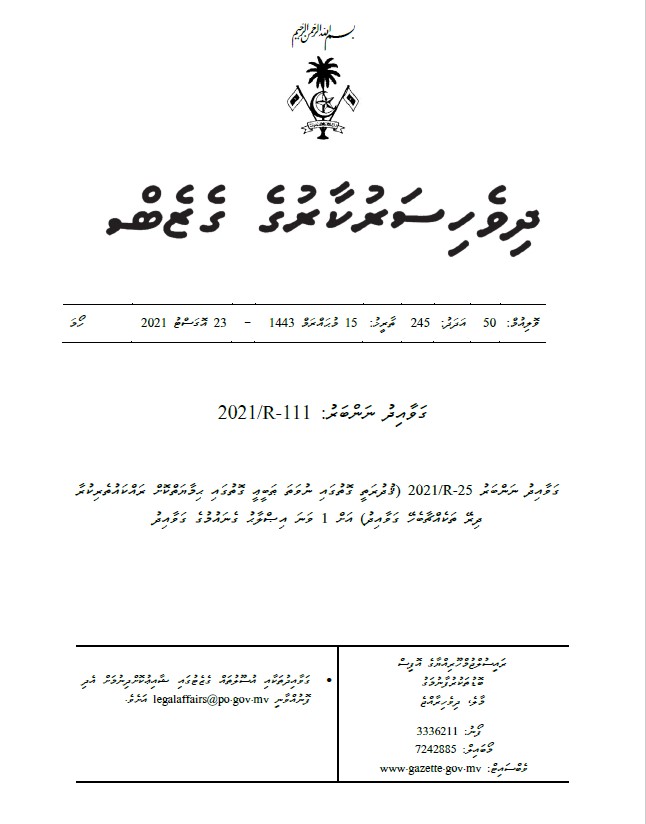 ގަވާއިދު ނަންބަރު R-25/2021 (ޤުދުރަތީ ގޮތުގައި ނުވަތަ ޠަބީޢީ ގޮތުގައި ޙިމާޔަތްކޮށް ރައްކައުތެރިކުރާ ދިރޭ ތަކެއްޗާބެހޭ ގަވާއިދު) އަށް 1 ވަނަ އިޞްލާޙު ގެނައުމުގެ ގަވާއިދު