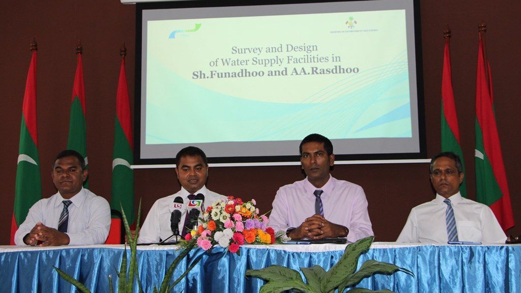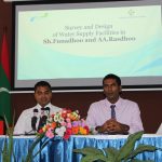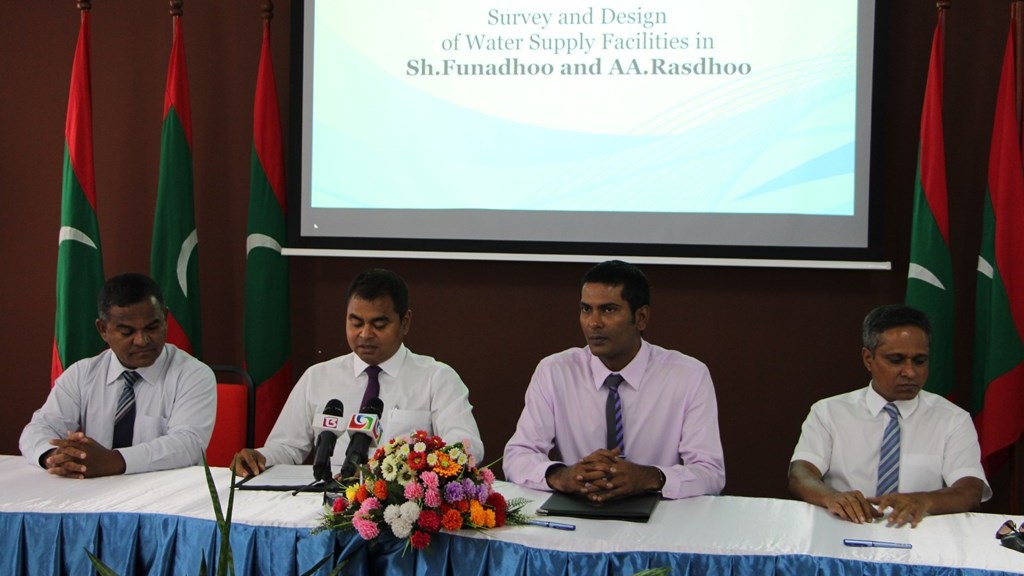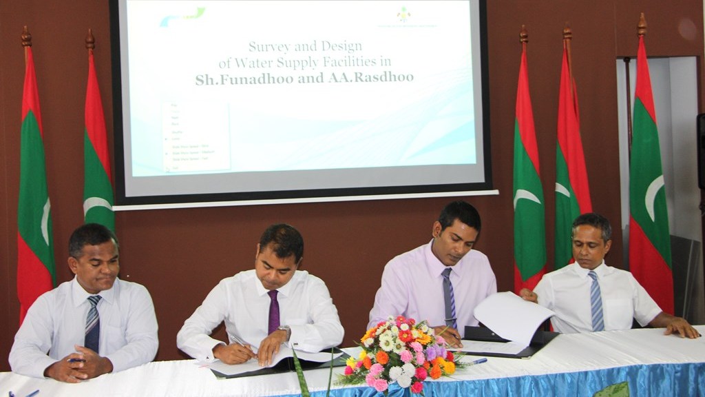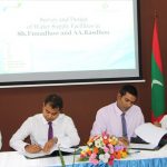 MOU signed to establish Survey and Design of provision of Water Supply Facilities in Shaviyani atoll Funadhoo and Alifu Alifu atoll Rasdhoo. Minister of Environment and Energy, Mr. Thoriq Ibrahim signed the contract on behalf of the Ministry while the Managing Director of Male’ Water and Sewerage Company, Mr. Fazul Rasheed signed the MOU on behalf of the company.
