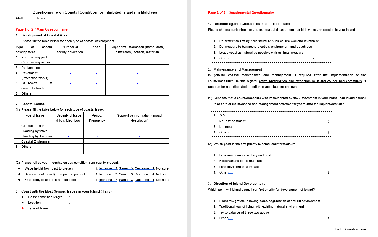 The main objective of this project is to strengthen the long-term and sustainable resilience of Maldives Islands against climate change for enhancing economic development of the islands while maintaining the sustainable link between the residents and the beaches and implementing appropriate management of coral reefs, and beach and coastal vegetation with physical measures at the coastal areas through combination of soft and hard components.